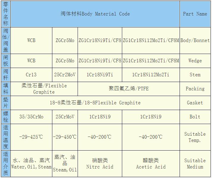 精鑄重型帶材質閘閥主要零件材料: