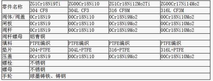 二、Z41W-16P(R) Z41W-25P(R) Z41W-40P(R) Z41W-64P(R)不銹鋼閘閥的主要零件材質: