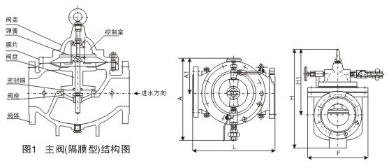 水力控制閥分隔膜型和活塞型兩類,工作原理相同,都是以上下游壓力差△P為動力,由導閥控制,使隔膜(活塞)液壓式差動操作,完全由水力自動調(diào)節(jié),從而使主閥閥盤完全開啟或完全關(guān)閉或處于調(diào)節(jié)狀態(tài)。當進入隔膜(活塞)上方控制室內(nèi)的壓力水被排到大氣或下游低壓區(qū)時,作用在閥盤底部和隔膜下方的壓力值就大于上方的壓力值,所以將主閥閥盤推到完全開啟的位置;當進入隔膜(活塞)上方控制室的壓力水不能排到大氣或下游低壓區(qū)時,作用在隔膜(活塞)上方的壓力值就大于下方的壓力值,所以就會把主閥閥盤壓到完全關(guān)閉的位置;當隔膜(活塞)上方控制室內(nèi)的壓力值處于入口壓力與出口壓力中間時,主閥閥盤就處于調(diào)節(jié)狀態(tài),其調(diào)節(jié)位置取決于導管系統(tǒng)中的針閥和可調(diào)導閥的聯(lián)合控制作用。可調(diào)導閥可以通過下游的出口壓力并隨它的變化而開大或關(guān)小其自身的小閥口,從而改變隔膜(活塞)上方控制室的壓力值,控制主閥閥盤的調(diào)節(jié)位置。