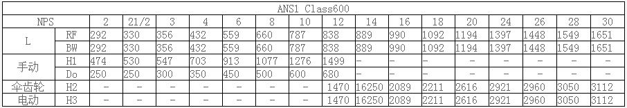 Major external dimensions of ANS1 Class600 standard chromium molybdenum steel gate valve: